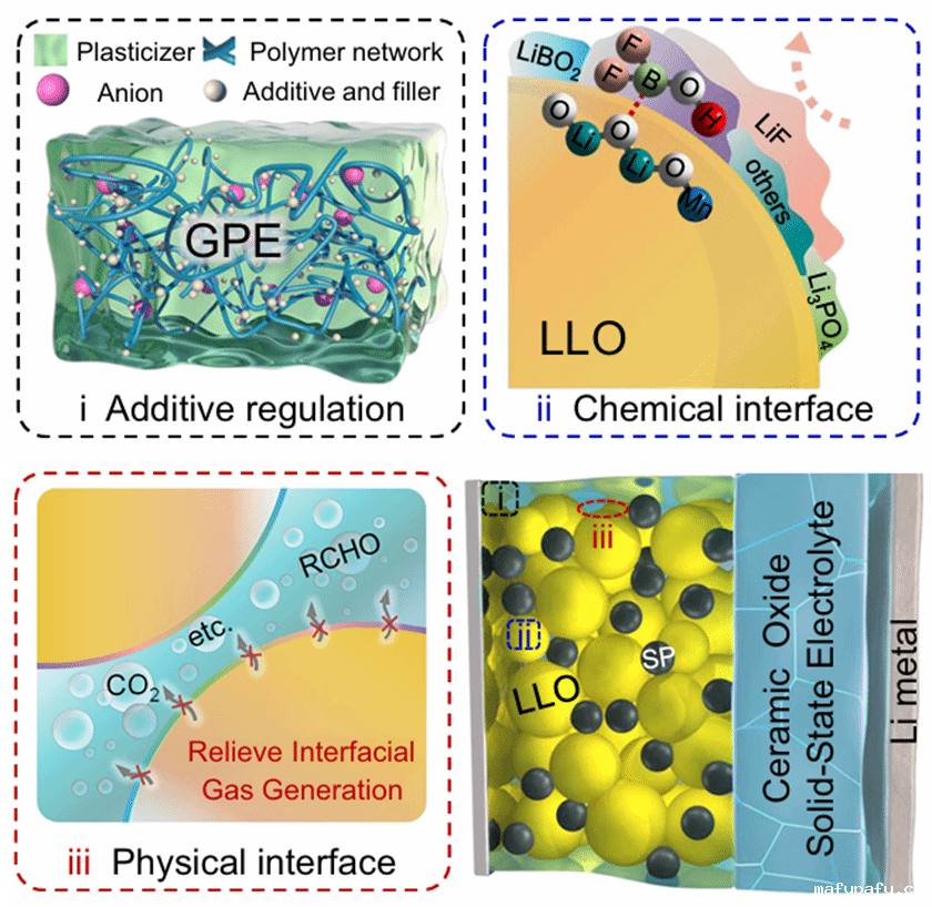 研究团队利用添加剂改变了GPE中的Li离子化学环境,由此增强交联的GPE可以更有效地固定大分子尺寸的阴离子,从而增强整体的抗氧化能力以及Li离子的迁移效率。此外,添加剂的分解促进了富氟、富硼无机CEI层的生成,有效抑制了界面副反应,稳定了正极晶格氧以及抵抗HF腐蚀。在富无极组分的CEI与高交联的GPE协同作用下,电解质的分解产气、物理接触损失和界面阻抗分化问题得到了有效缓解。